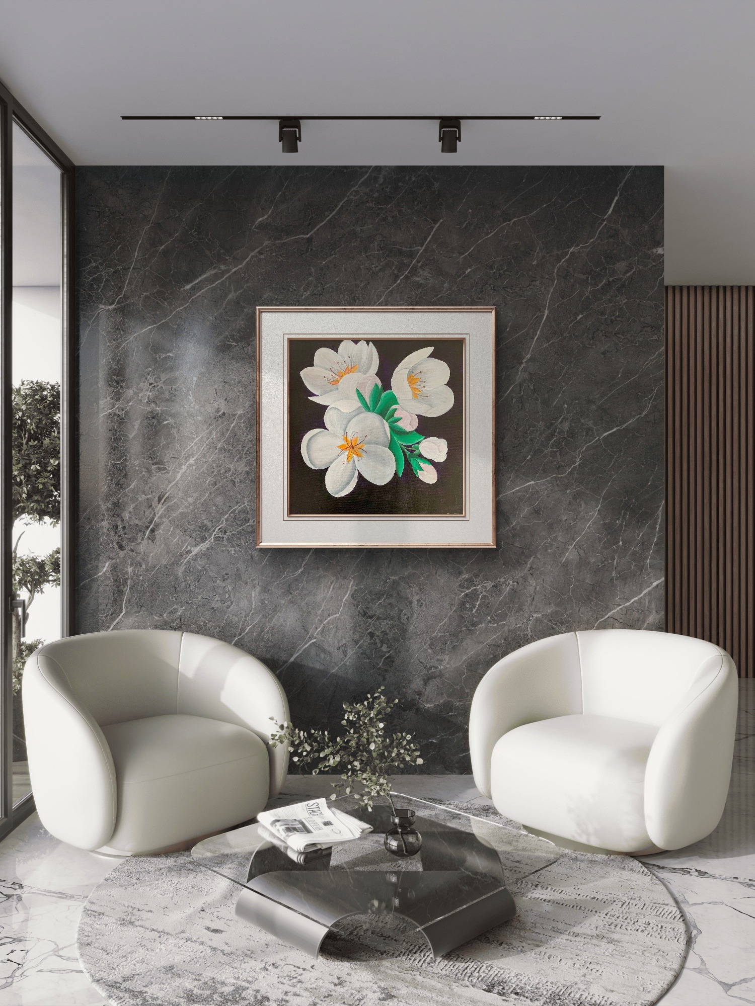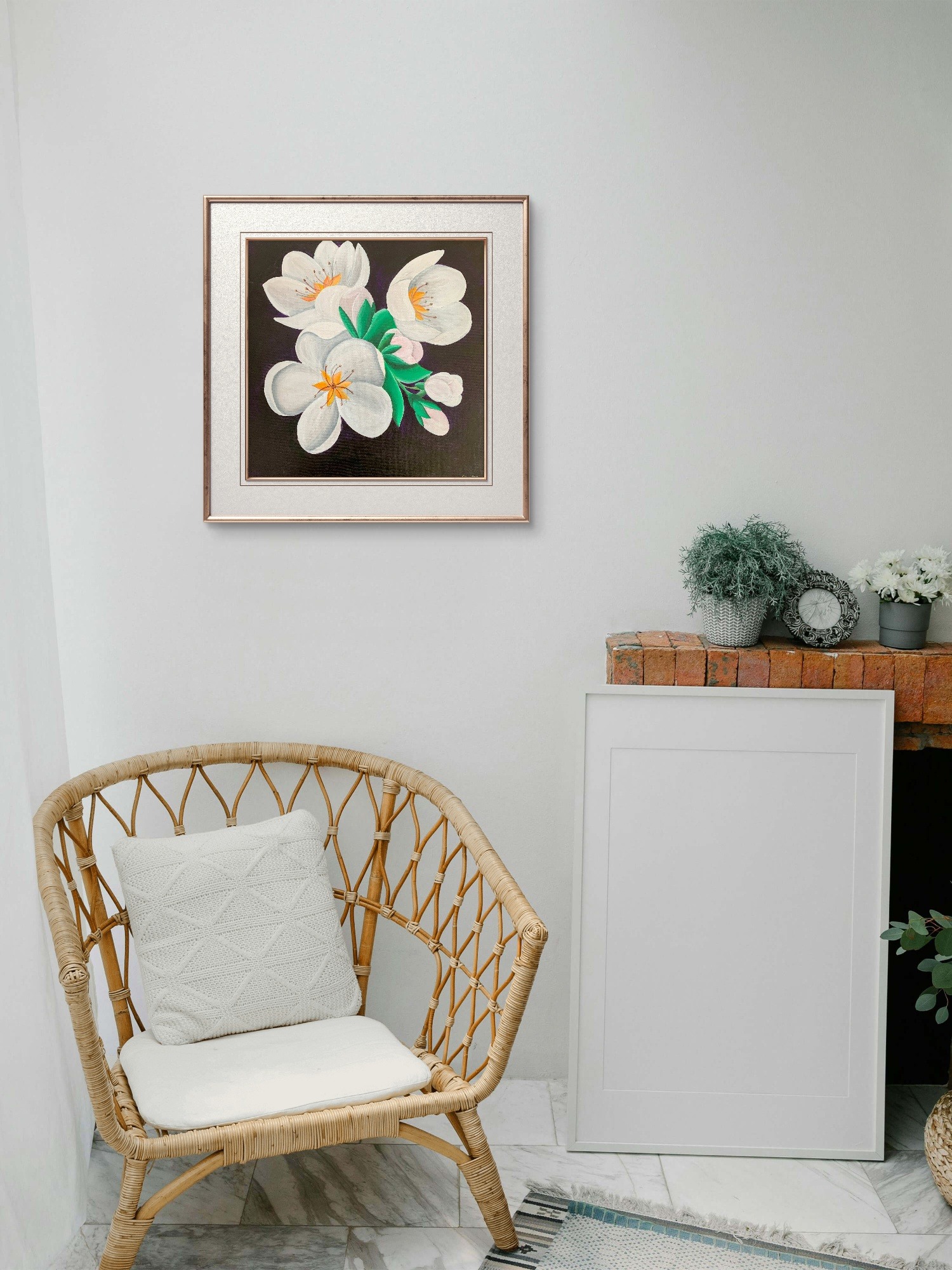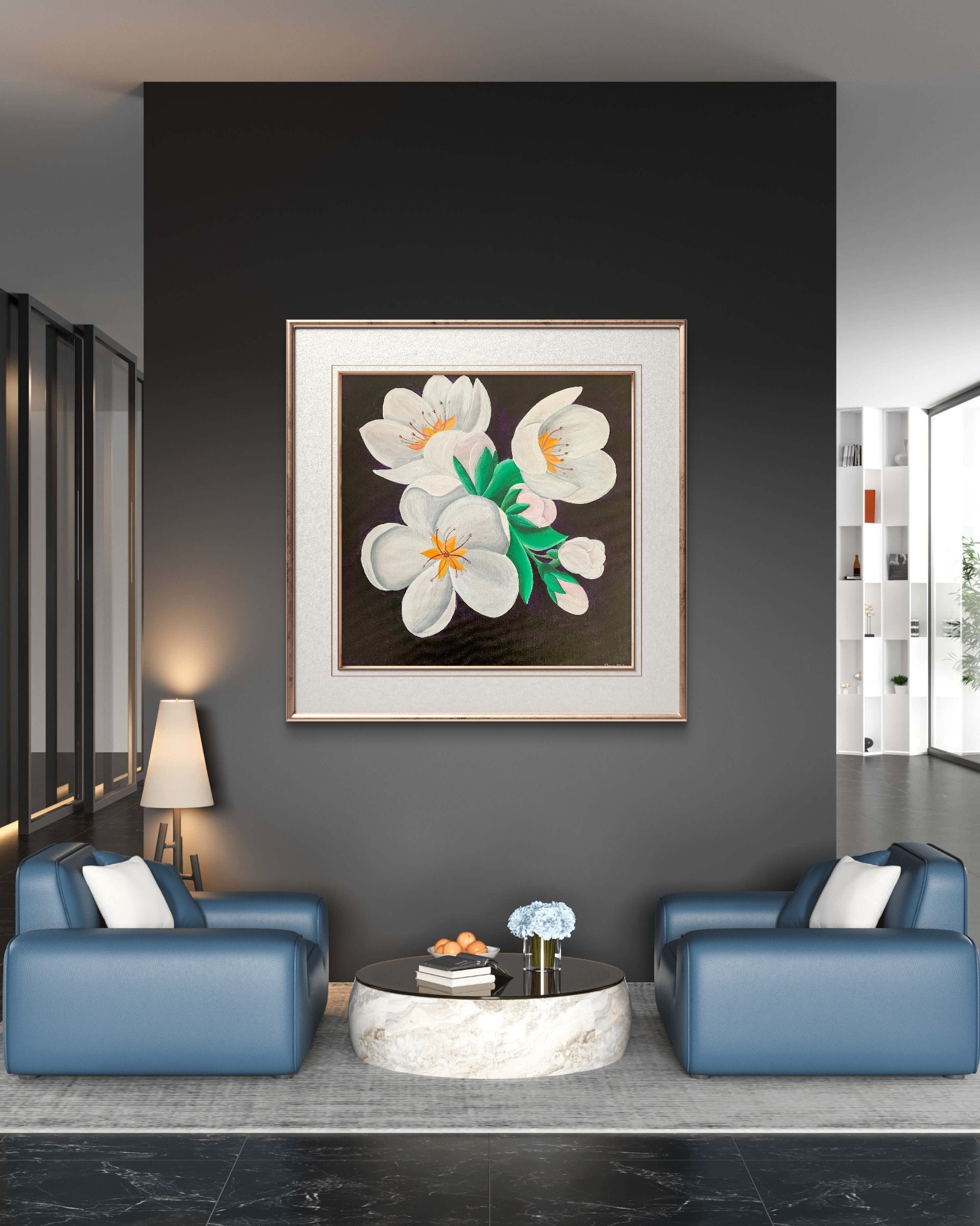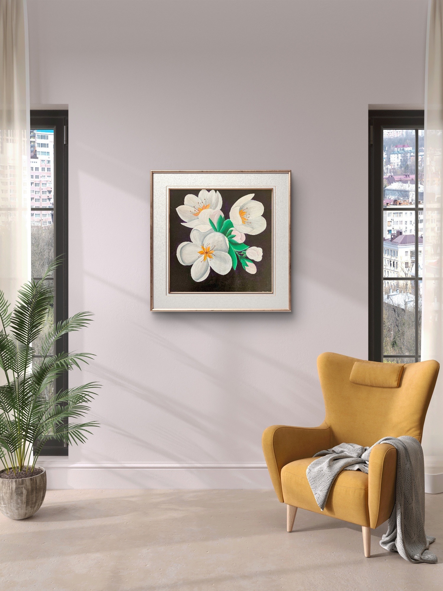 Prin tehnica acrilicului, tabloul imbina nuante vibrante si tonuri subtile, creand un efect tridimensional si profund. Acrilicele sunt cunoscute pentru durabilitatea si intensitatea lor cromatica, ceea ce face ca aceasta opera de arta sa reziste in timp si sa pastreze stralucirea culorilor. Fiecare pensula aplicata cu atentie contribuie la redarea texturii naturale a petalelor si a frunzelor, aducand o vibratie unica tabloului.