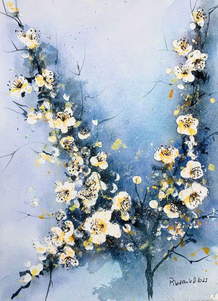 Tablou Trandafiri albi, pictat manual in acuarela, 28x38cm