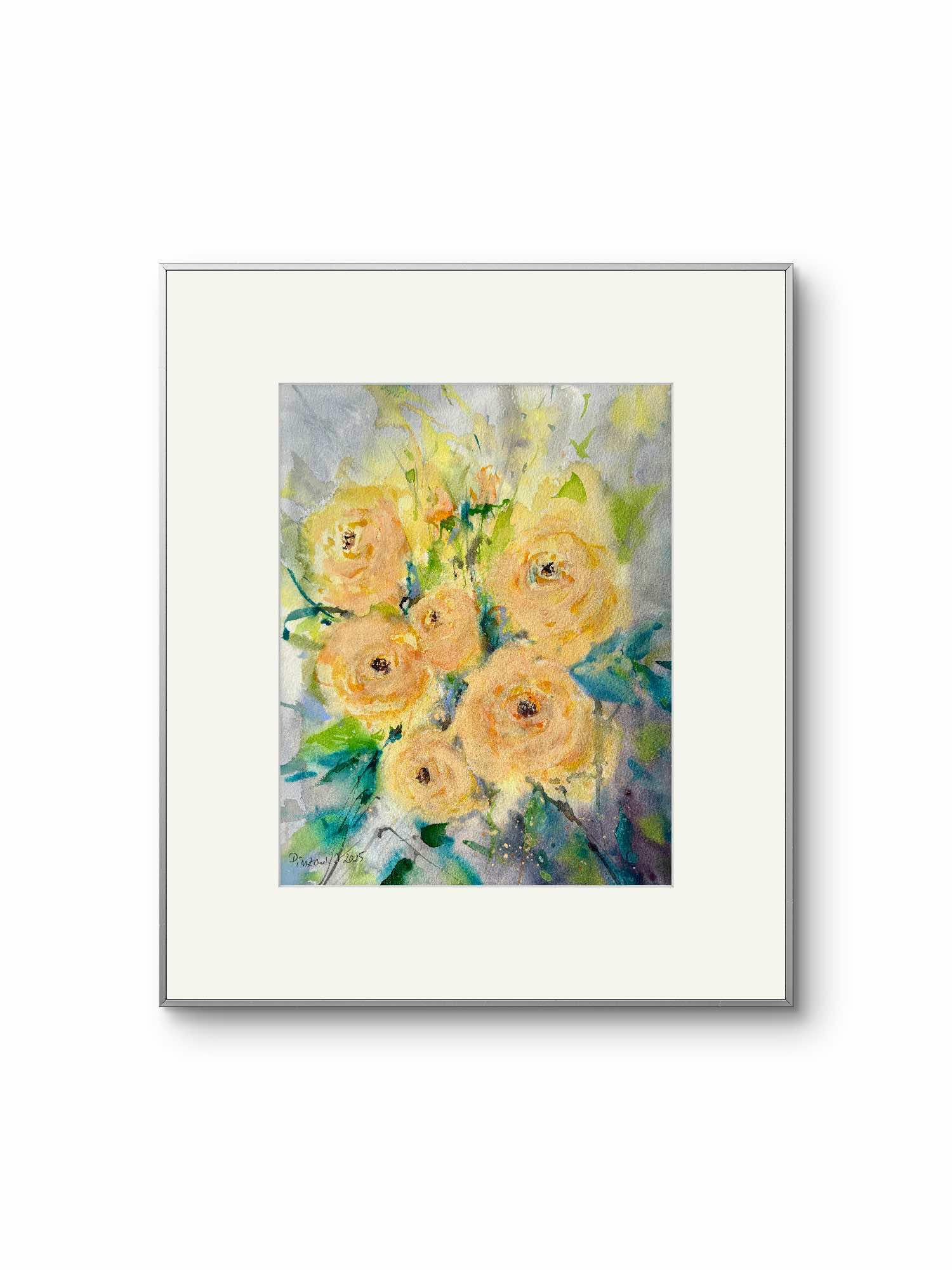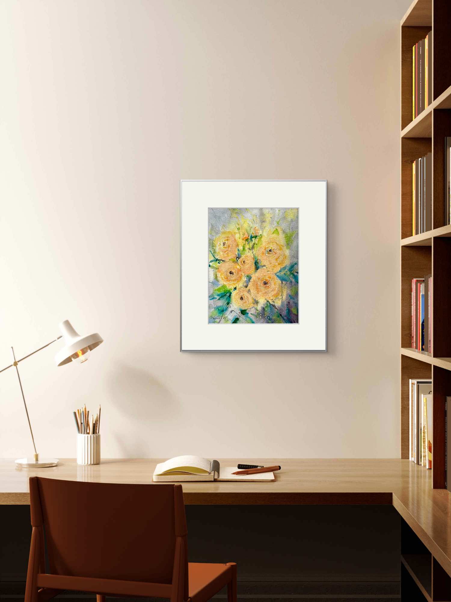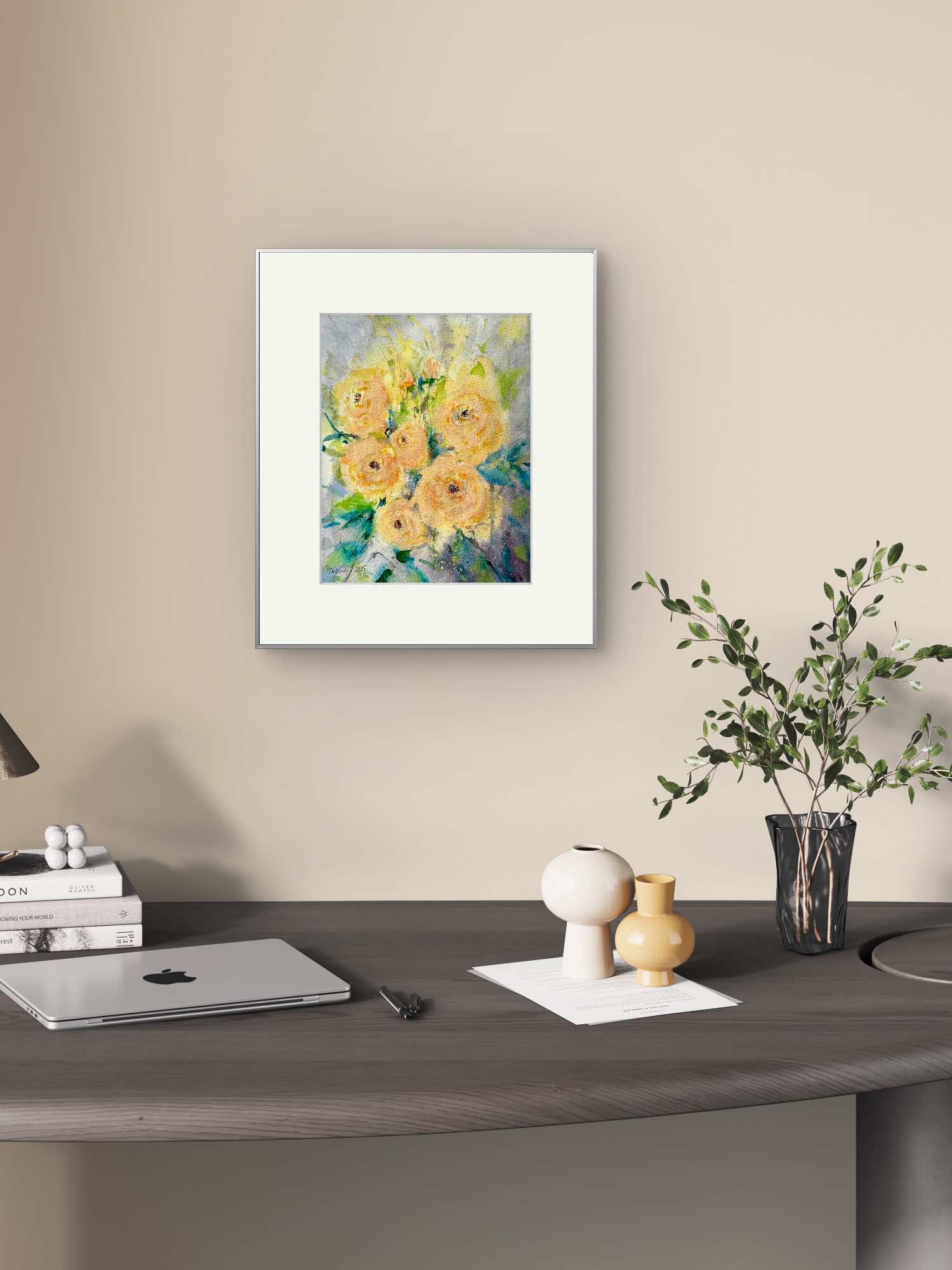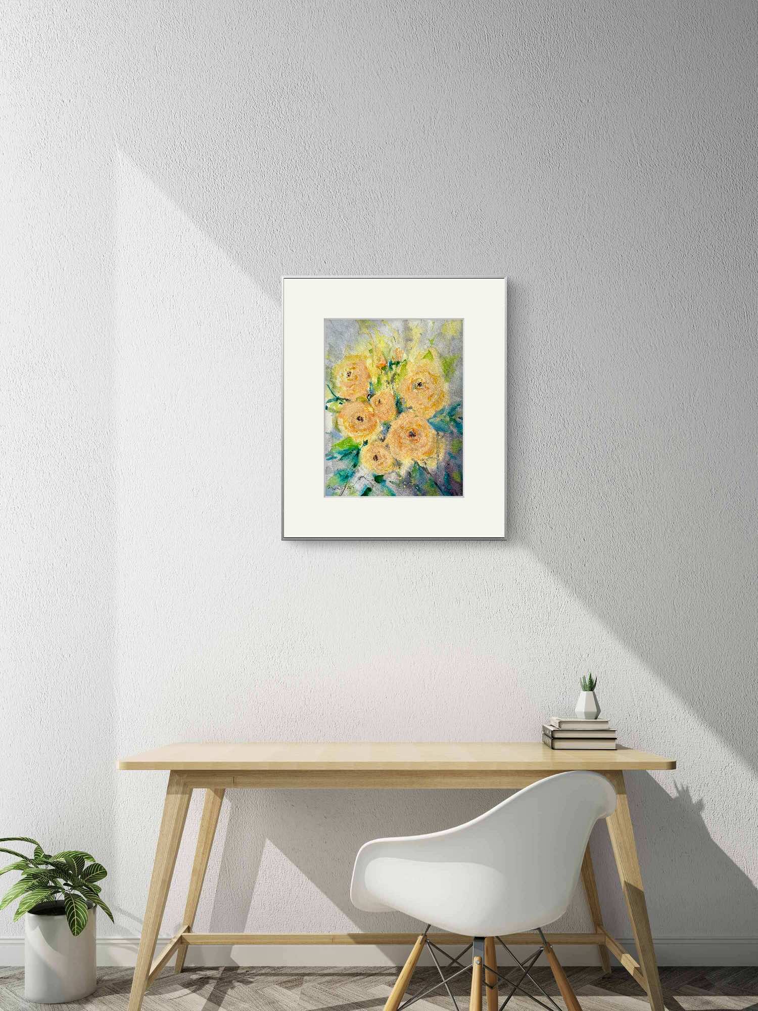 Tablou „Eleganta trandafirilor galbeni” este livrat elegant, incadrat in paspartu alb, evidentiind subtilitatea si rafinamentul picturii in acuarela. Aceasta prezentare permite fiecarui client sa aleaga rama potrivita propriului stil de decor, transformand tabloul intr-o piesa personalizata.