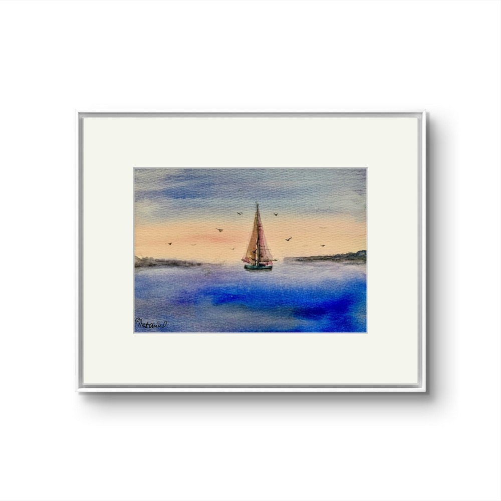 Tablou Barca Solitara in Amurg, Pictura in acuarela 12x17cm