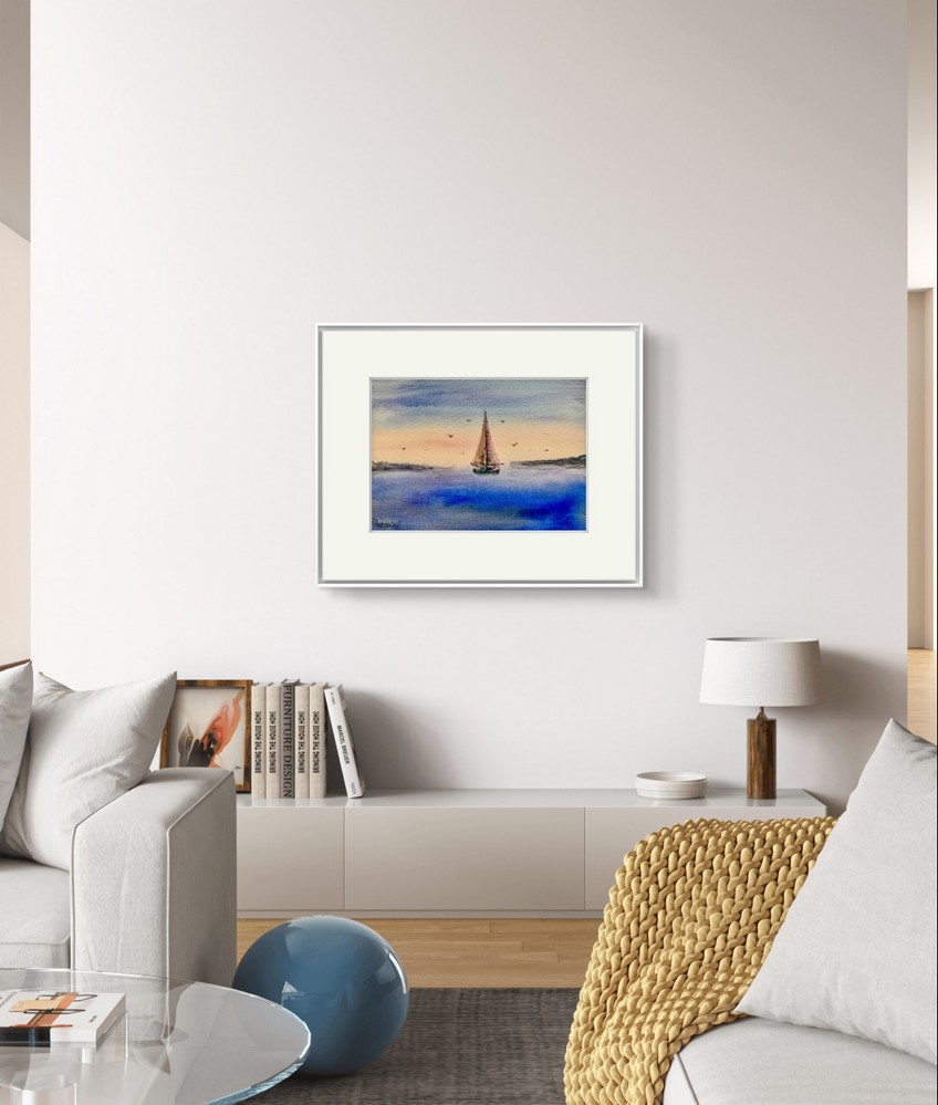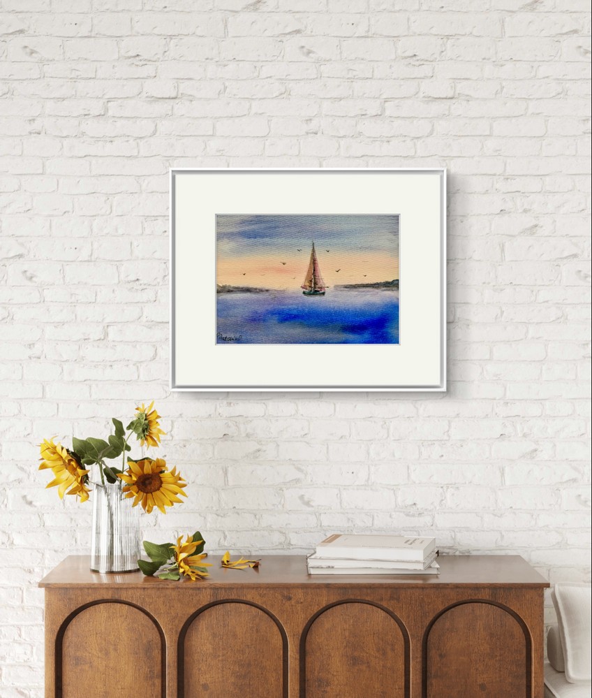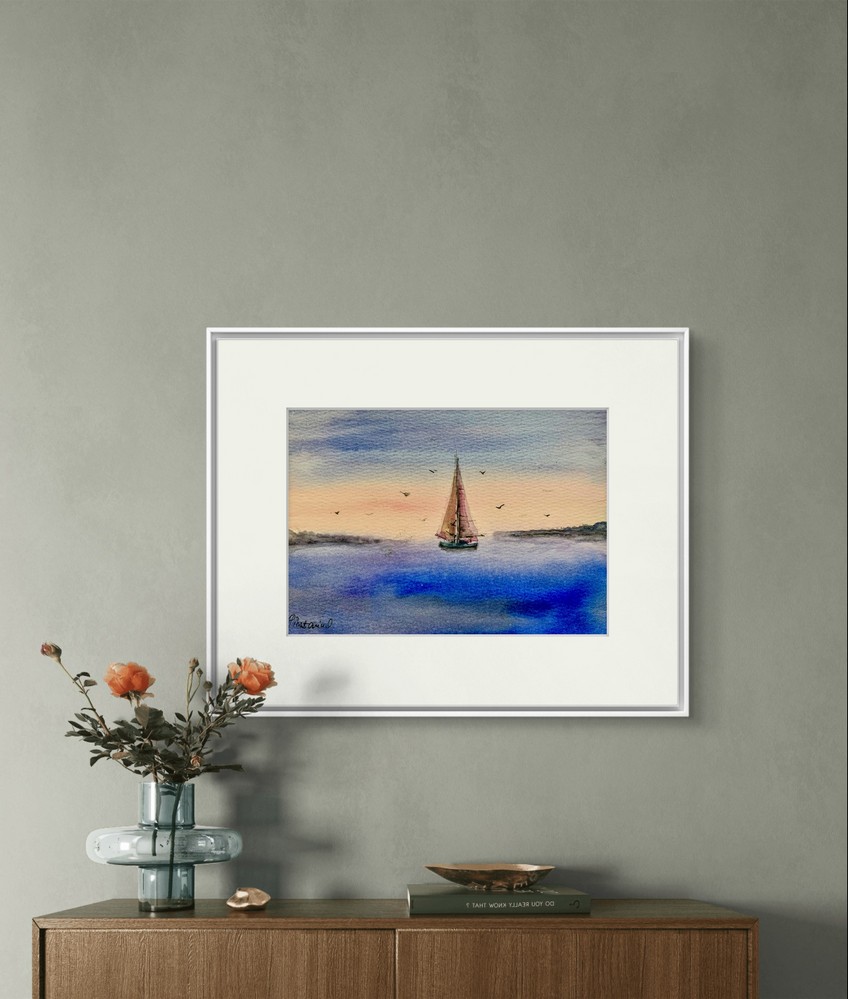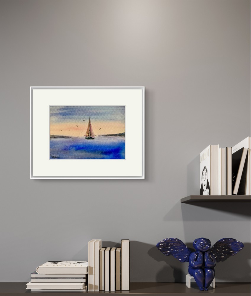 Compozitia echilibrata si detaliile fine ale barcii aduc o nota de rafinament si eleganta tabloului. Acest tablou este perfect pentru decorarea camerei de zi, a biroului sau a unui spatiu dedicat relaxarii. Dimensiunea sa compacta permite integrarea sa in orice tip de decor, aducand un plus de culoare si armonie. Livrat fara rama, tabloul vine insotit de un paspartu alb, care evidentiaza frumos culorile vii si detaliile picturii.