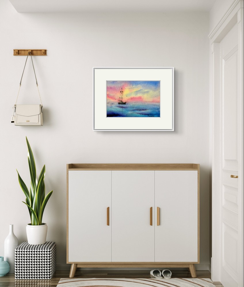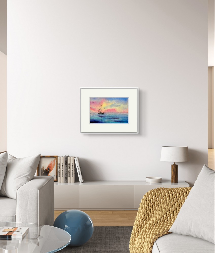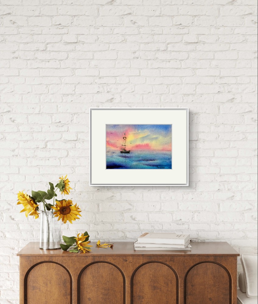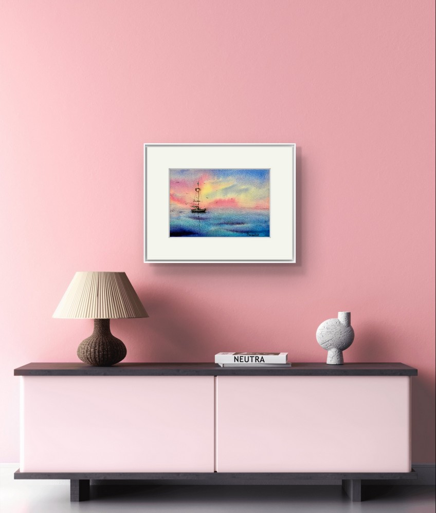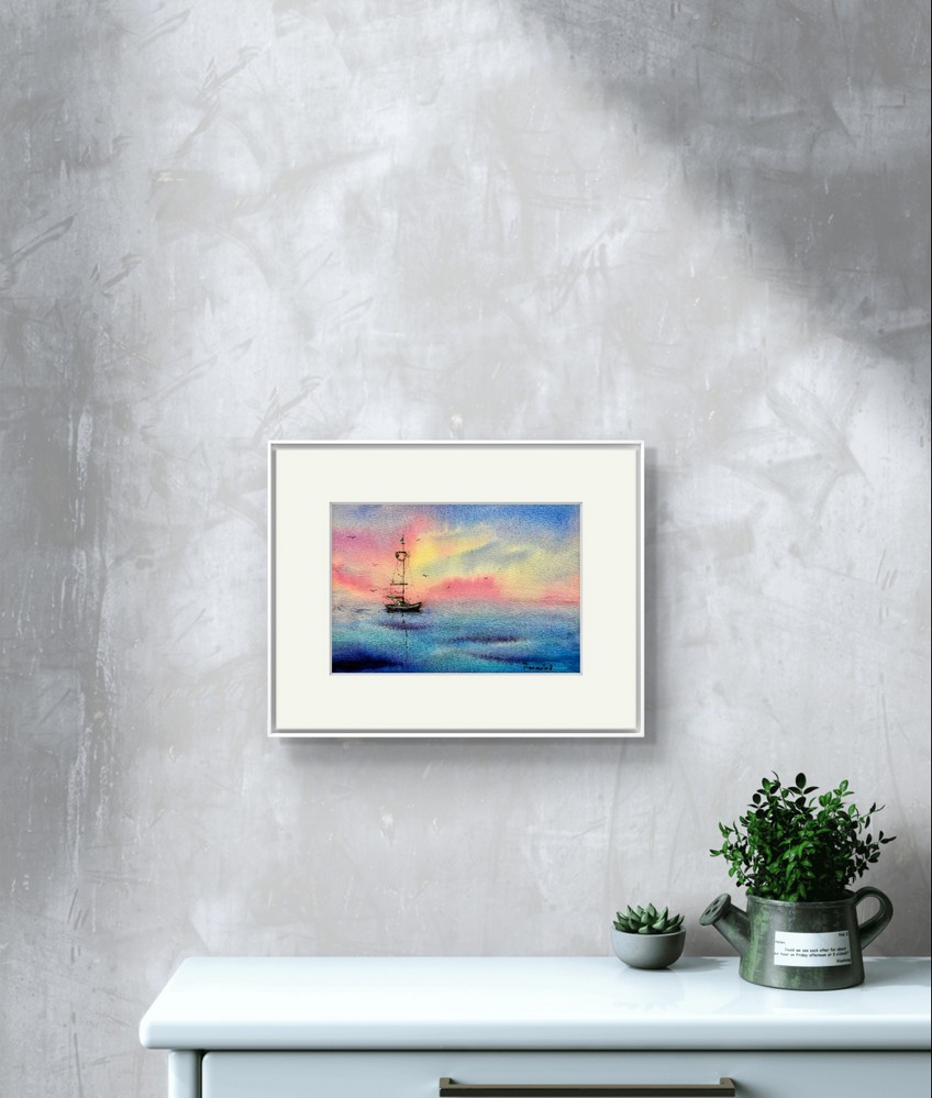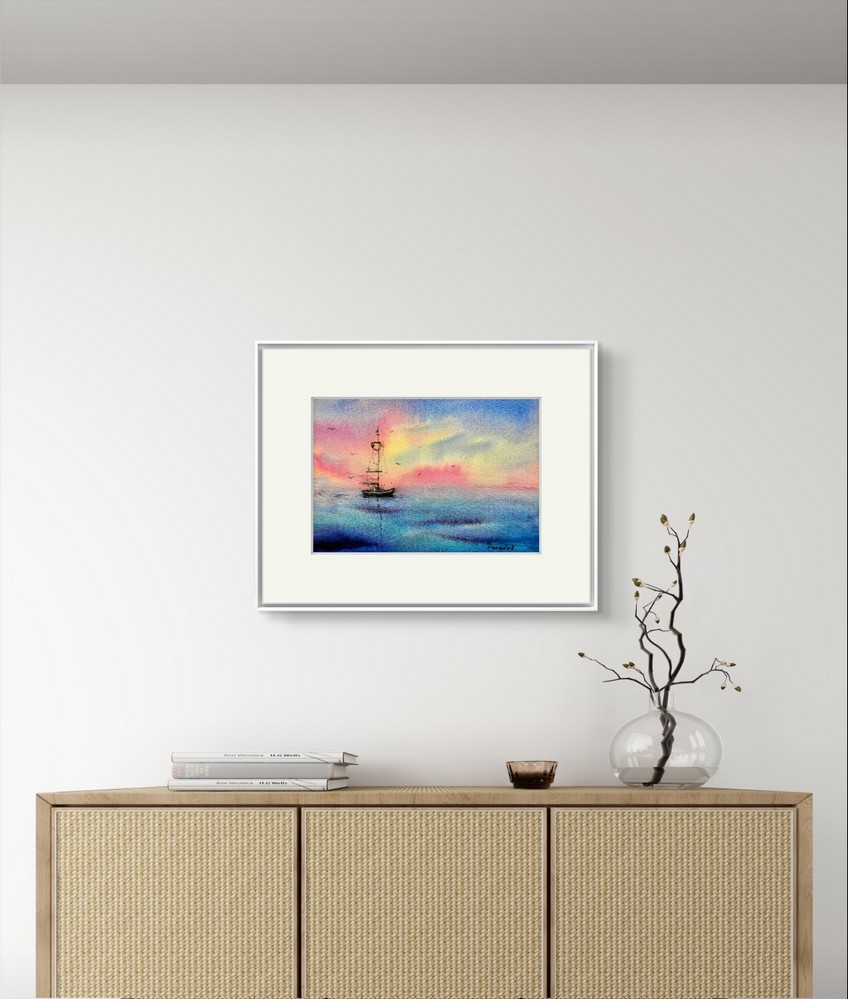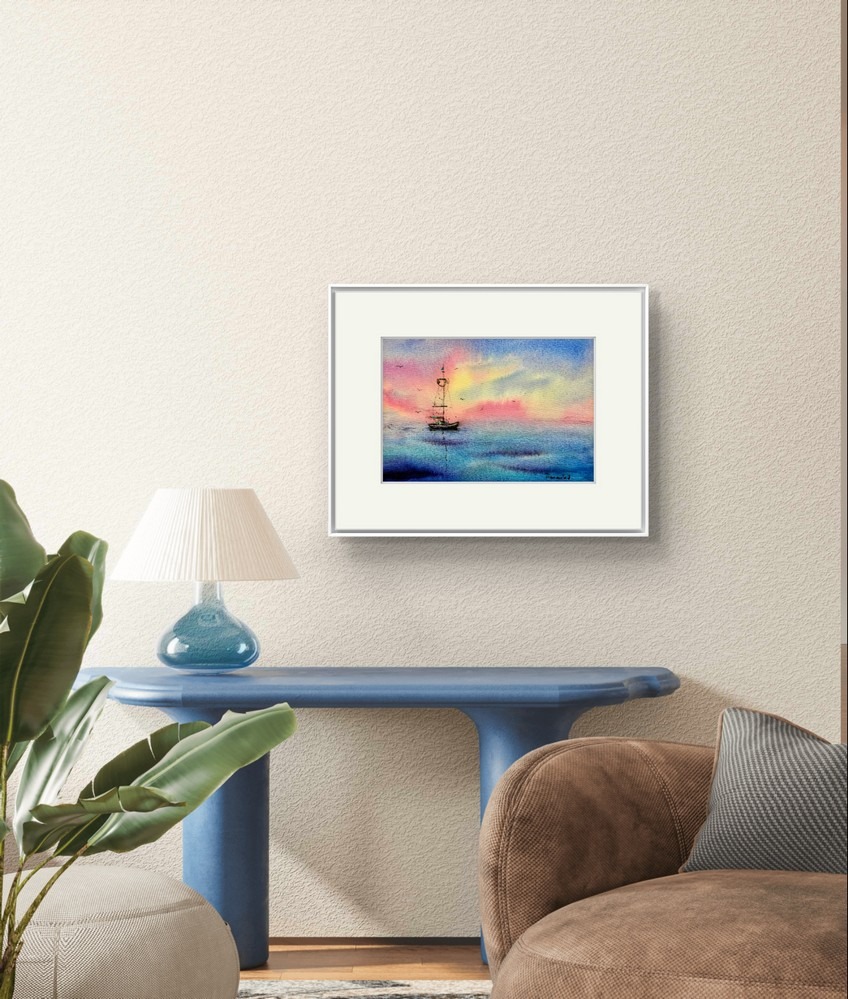 Tablou marin cu barca la apus, pictat in acuarela. Perfect pentru decorul tau! Exploreaza acum colectia de peisaje marine de la Pictura Hobby.