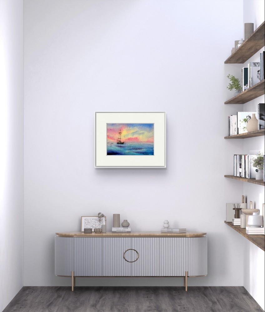 Tablou marin Barca la apus, pictura in acuarela 12x17cm