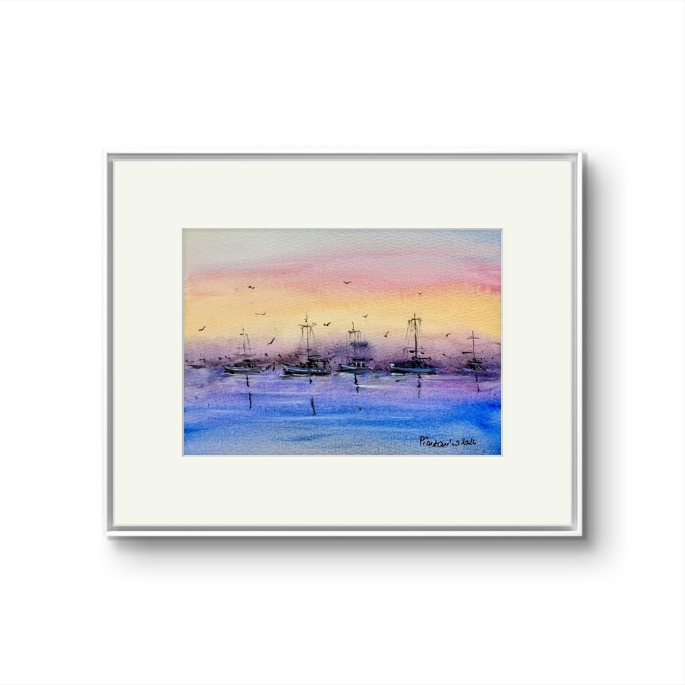 Tablou marin Barci la amurg, pictura in acuarela 12x17cm