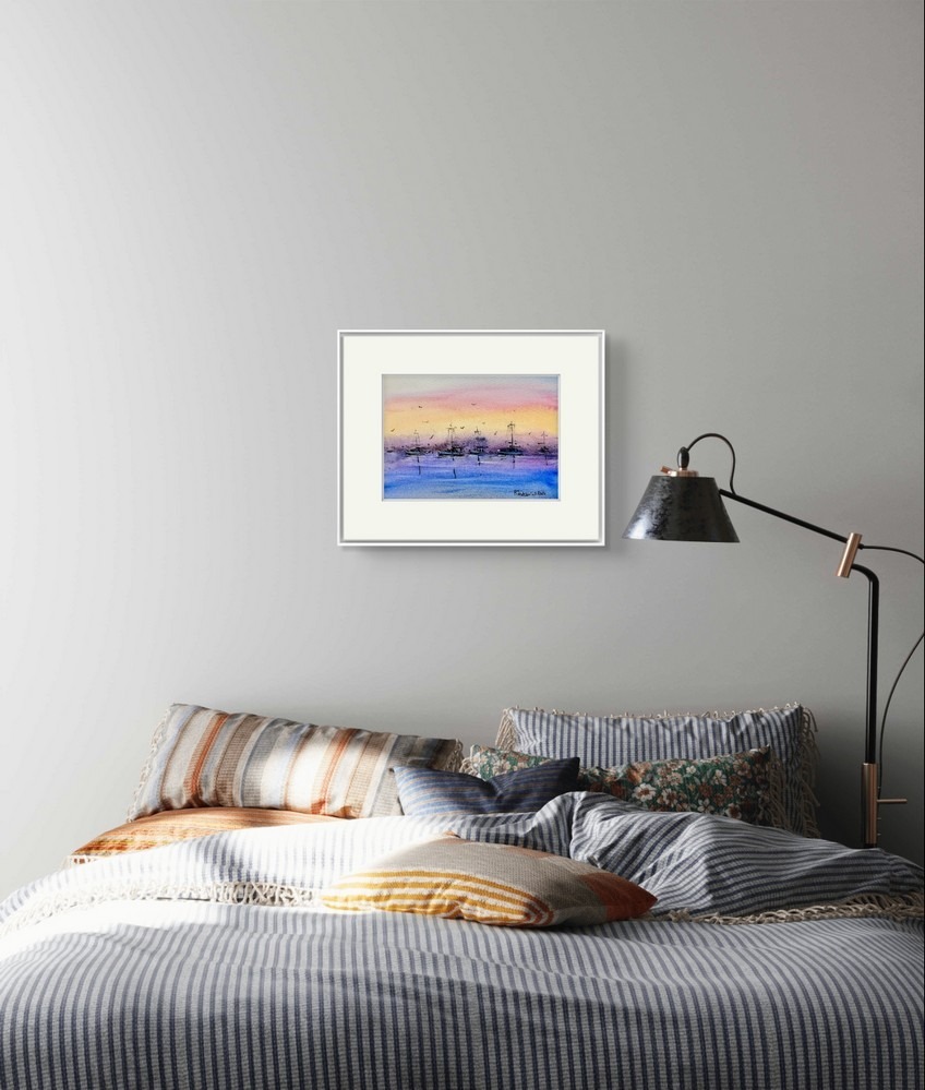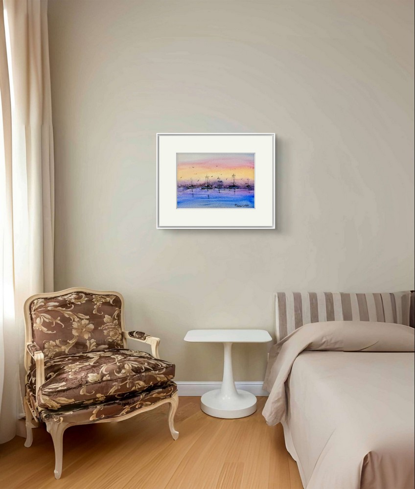 Fiecare detaliu al acestui tablou este atent realizat, de la contururile delicate ale barcilor pana la nuantele subtile ale cerului. In plus, tehnica acuarelei adauga o textura unica si o profunzime vizuala ce face ca acest peisaj sa para aproape real. Este ideal pentru cei care apreciaza arta marina, peisajele marine sau pur si simplu doresc sa aduca un strop de calm si frumusete in spatiul lor de locuit.