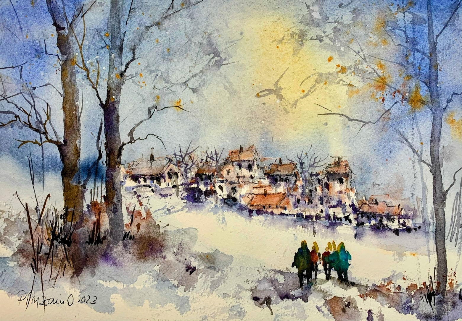 Cu tonuri delicate de albastru si galben, aceasta pictura surprinde lumina blanda a zorilor care se reflecta in zapada proaspata. Casele asezate pe fundal, inconjurate de copaci dezgoliti, ofera un sentiment de liniste si pace, in timp ce grupul de oameni care se indreapta catre sat adauga o nota de viata si caldura. Fiecare detaliu din acest tablou este realizat cu migala, de la texturile subtile ale copacilor acoperiti de zapada, pana la nuantele cerului in dimineata rece de iarna.